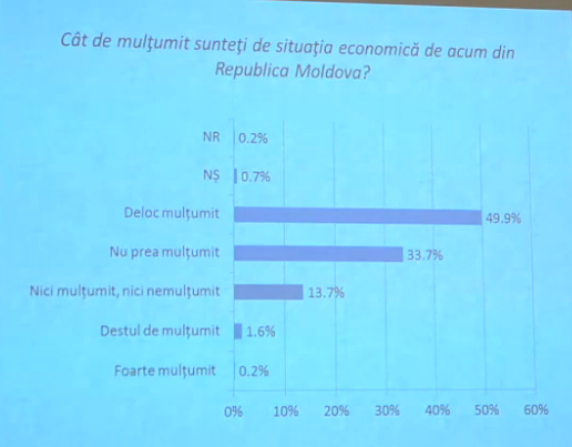 Таким образом, согласно данным исследования, совершенно недовольны положением дел в Молдове 49,9%. Еще 33,7% — недовольны. И лишь 1,8% опрошенных довольны.