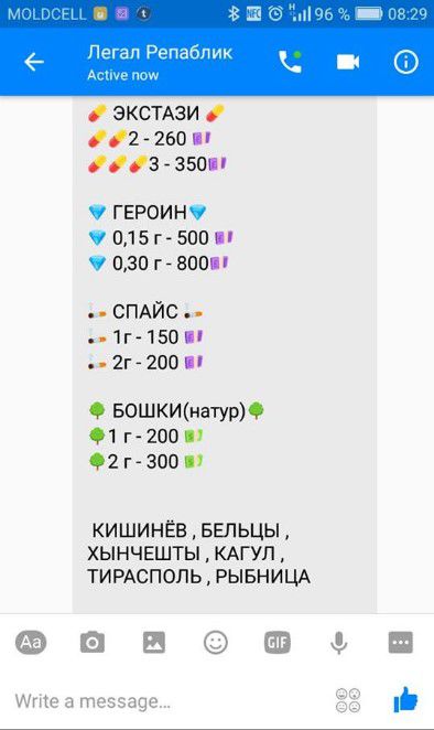 На странице размещен внушительный список наркотиков синтетического или биологического происхождения с указанием цен. Самый дешевый из них – «спайс», смесь трав и психотропных веществ стоимостью 150 леев за 1 грамм. Самый дорогой наркотик, продающийся на странице – героин стоимостью от 2000 леев за 1 грамм.
