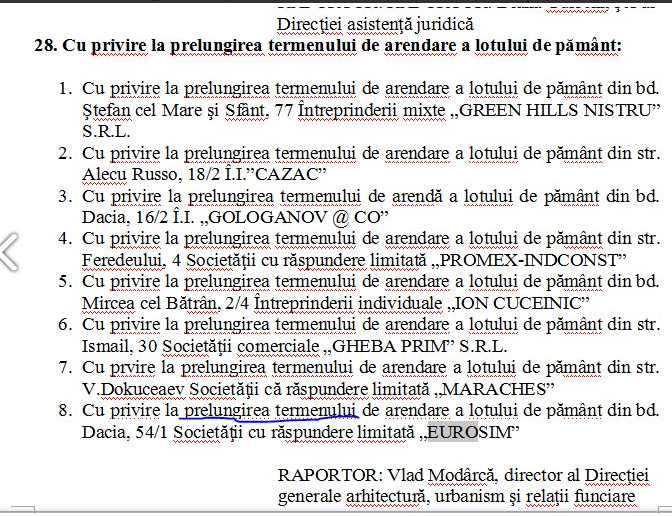 În septembrie 2015, ZdG scria despre modul în care firma „Eurosim” a obţinut dreptul de arendă şi asupra unui teren de 1300 m.p., aflat lângă cel pe care este amplasată benzinăria. Astfel, în decembrie 2010, în cadrul şedinţei Consiliului Municipal Chişinău (CMC), când s-a pus în discuţie prelungirea arendei terenului din bd. Dacia pentru firma „Eurosim”, pe care avea deja construită benzinăria, printr-un punct separat, s-a acceptat şi cedarea, tot în baza unui contract de arendă, către acelaşi SRL, a terenului adiacent. Experţi în domeniu afirmau atunci că o asemenea tranzacţie trebuia făcută prin intermediul unei licitaţii, or, terenul dat în arendă firmei lui Ghimpu nu avea pe el niciun fel de construcţii, pentru a putea fi acordat prin acest scenariu. Pe site-ul Primăriei mun. Chişinău, o asemenea decizie a CMC, din 2 decembrie 2010, nu există. Solicitaţi de ZdG, reprezentanţii Direcţiei Relaţii Funciare ne-au spus însă că, după hotărârea CMC de acum aproape şase ani, Oficiul Teritorial Chişinău al Cancelariei de Stat s-a adresat în judecată, nefiind de acord cu poziţia Consiliului, doar că judecătorii de la Curtea Supremă de Justiţie, într-un final, au considerat că CMC a luat o decizie legală. Astfel, şi din acest motiv, pe 18 februarie 2015, între autorităţile locale şi firma „Eurosim” a fost semnat un nou contract de arendă, valabil până în februarie 2025. În toată această perioadă, agentul economic trebuie să plătească 24,56 mii de lei anual, adică puţin peste 2 mii de lei pe lună pentru acel teren. Firma nu are dreptul să privatizeze terenul.