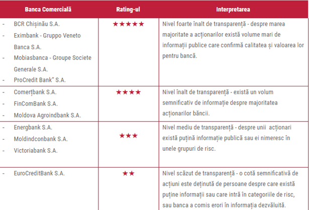 Пять молдавских банков обладают высоким уровнем тарнспарентности в том, что касается сведений об акционерах. Еще три банка предоставляют достаточные сведения об акционерах, еще в трех банках эта информация очень скудная, а одному из молдавских финансовых учреждений присвоили низкий уровень транспаретности.