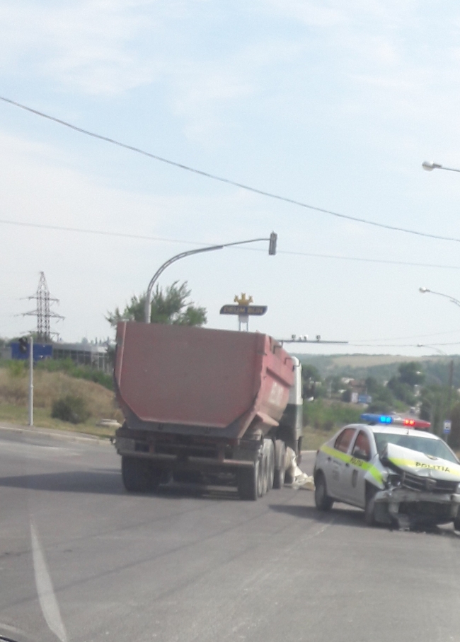 Mașina poliției de model Dacia a rămas zob după ce s-a tamponat violent cu celălalt automobil. Din fericire nicio persoană nu a avut de suferit.