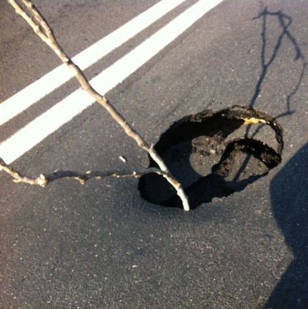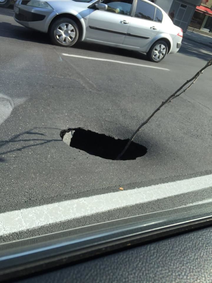 Огромную яму заметили автомобилисты, воткнув в дыру ветку.