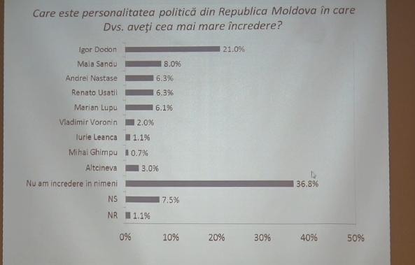 На втором месте расположилась Майя Санду – 8%. Третье место делят Ренато Усатый и Андрей Нэстасе, которые набрали 6,3%.