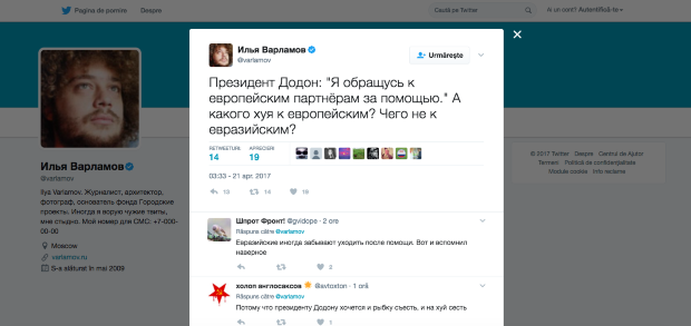 Через некоторое время один из самых популярных в России и за ее пределами блоггеров Varlamov увидел в этом тексте вместо "внешним" слово "европейским", причем что статус был написал на молдавском языке, решил съехидничать в твиттере.