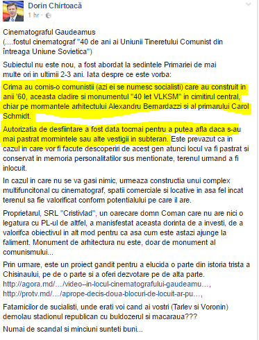 Так градоначальник в социальной сети объяснил решение примэрии о сносе кинотеатра «Гаудеамус». По его словам «преступление в 60-ые годы совершили коммунисты», которые построили кинотеатр на могилах двух исторических личностей.
