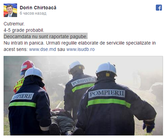 Примерно, в 01:30 генеральный примар Кишинева сделал публикацию в социальной сети и призвал людей не паниковать.