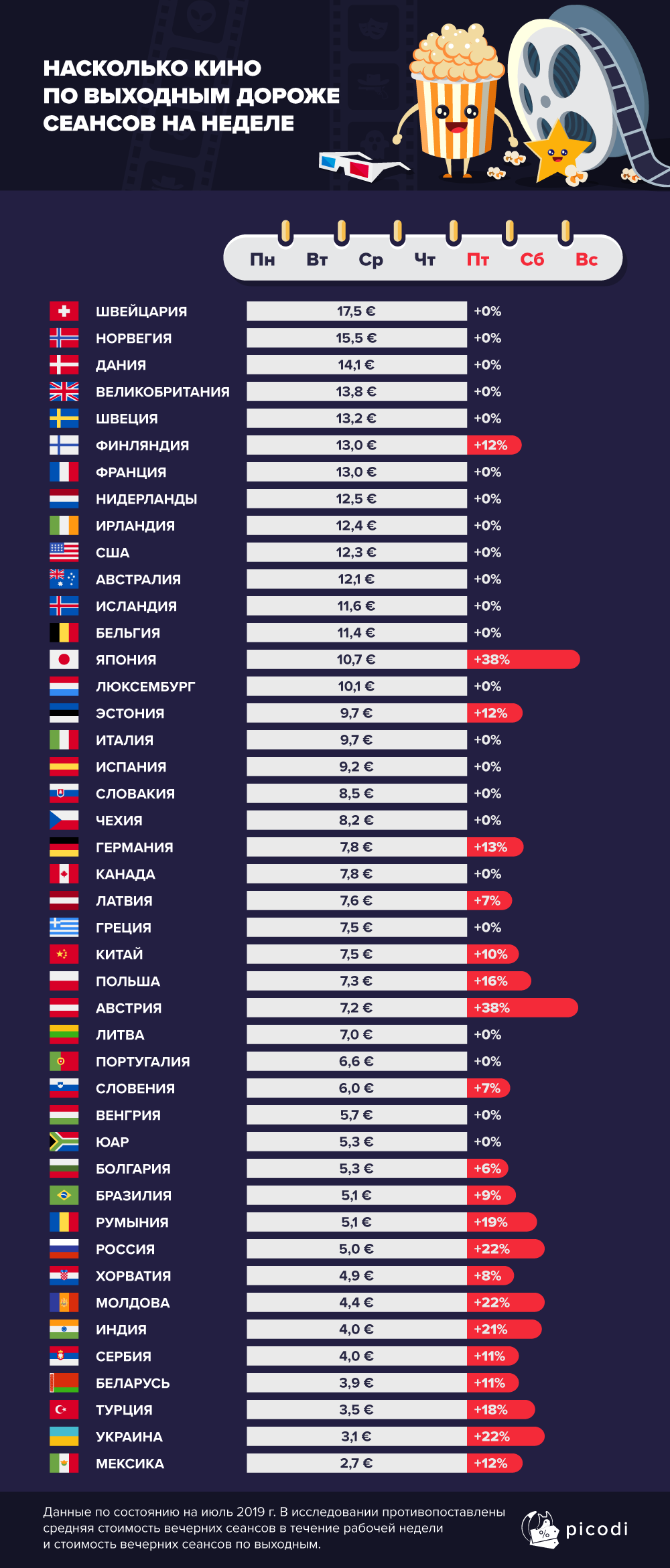 Принято считать, что сеансы в выходные дороже, чем в будние дни. Как поётся в известной песне, «и каждый вечер он без денег немного», поэтому каждый студент знает, что в кино лучше ходить на утренние сеансы на рабочей неделе. Например, в Молдове, билеты в уикенд (вечер пятницы, суббота и воскресенье) стоят в среднем на 22% дороже. Похожую разницу в цене можно встретить в Украине, Румынии и России, а в Японии и Австрии наценка достигает 38%.