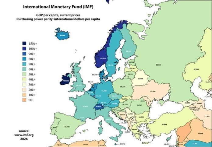 Республика Молдова вновь оказалась в конце европейского рейтинга по уровню благосостояния. Согласно прогнозу Международный валютный фонд на 2026 год, ВВП на душу населения с учётом паритета покупательной способности в стране составит всего 20,7 тысячи долларов. Это самый низкий показатель среди всех стран Европы.