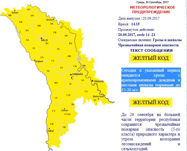 Предупреждение действительно с 14:00 до 21:00, 20 сентября. Данный период ожидается гроза с кратковременными дождями и местами шквалы порывами до 15-20 м/с.