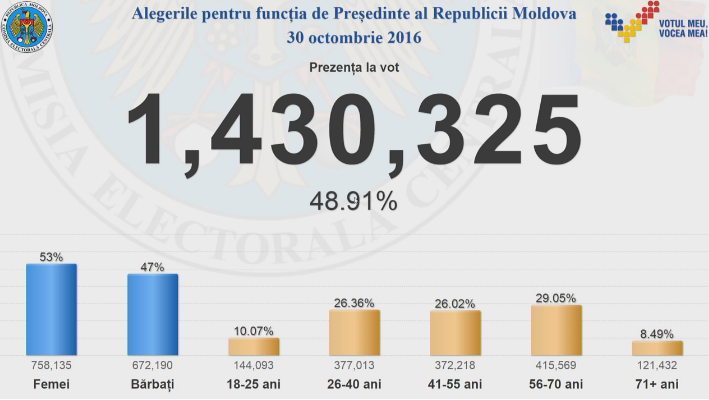 По данным ЦИК на 21.00 избирательная явка составила 48,91% . Таким образом, за президента страны проголосовало более 1 430 325 граждан, сообщает Actualitati.md.