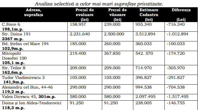 „Dacă pe piața imobiliară un metru pătrat de spații în centrul istoric al mun. Chișinău depășește 1 000 euro, atunci spațiile municipale sunt privatizate la prețuri de pînă la 100 euro m.p.. Imobilele sunt privatizate la prețuri cu mult mai mici decît valoarea stabilită de Întreprinderea de Stat „Cadastru”, se mai spune în raport.