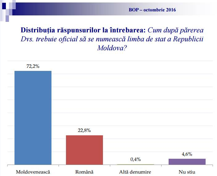 Potrivit studiului, la întrebarea — „Cum după părerea d-stră trebuie oficial să se numească limba de stat a Republicii Moldova?”, majoritatea covîrșitoare a respondenților circa – 72,2%, au declarat că aceasta trebuie să se numească – moldovenească.