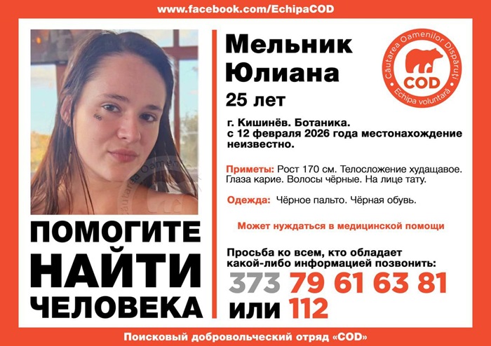 В столице идет поиск 25-летней жительницы Кишинёва Юлианы Мельник. Девушка проживает в секторе Ботаника и пропала 12 февраля. С тех пор её местонахождение остаётся неизвестным.