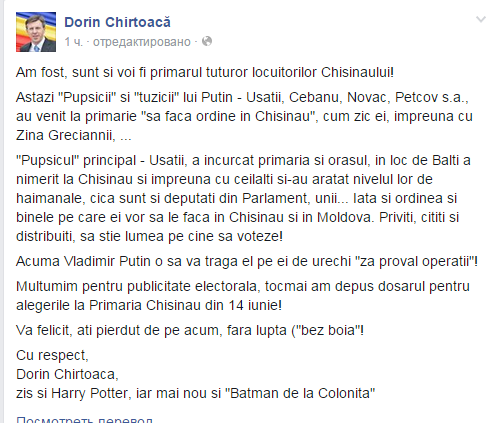 Позже раздвоение личности градоначальника произошло и на его странице в социальной сети. «С уважением, Дорин Киртоакэ, которого еще называют Гарри Поттер, а теперь еще и – Бэтмен из Колоницы», — подписал одну из своих записей либерал.