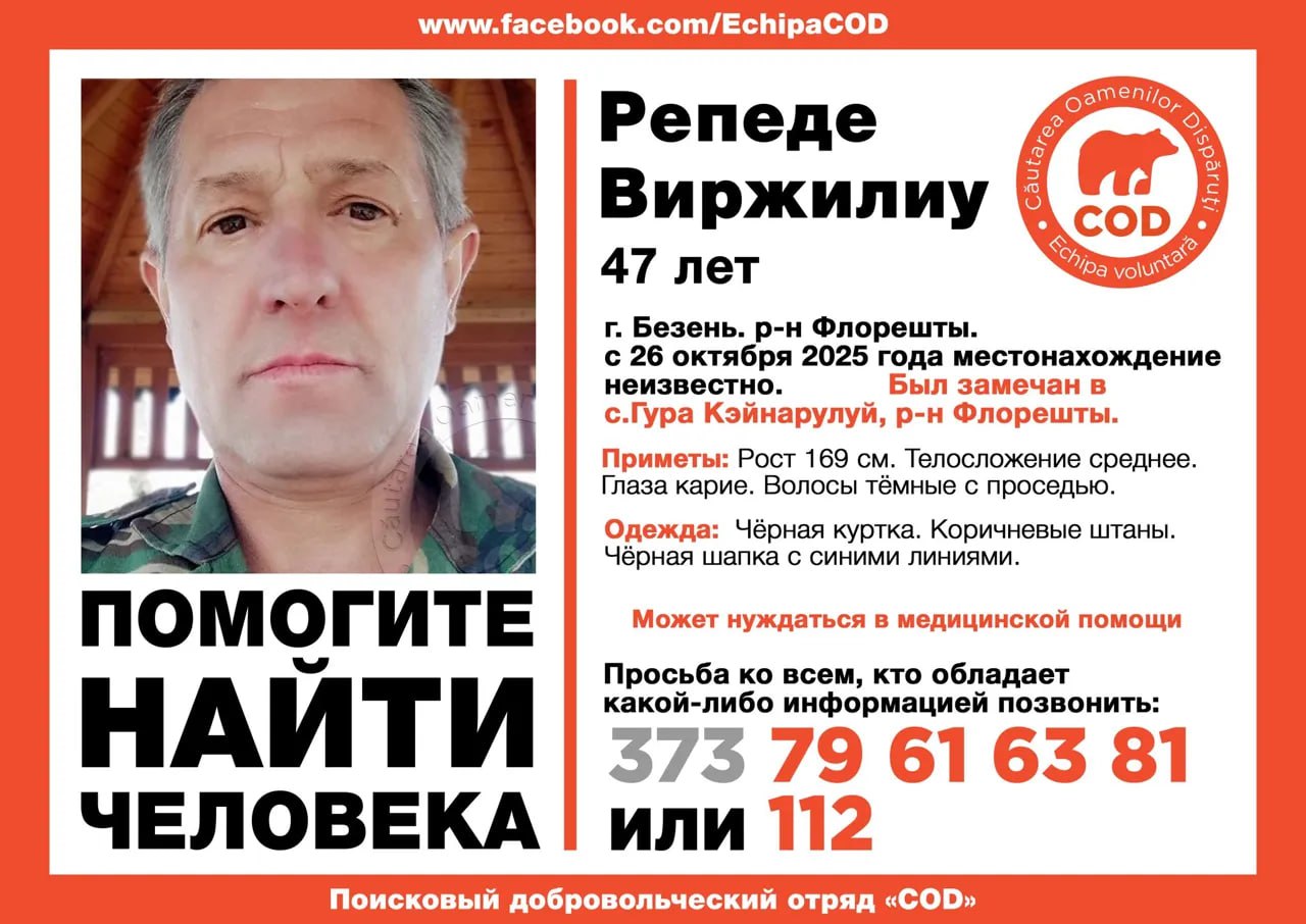 Во Флорештском районе продолжаются поиски 47-летнего жителя села Безень, который исчез 26 октября. По информации поисковой команды COD, мужчину в последний раз видели в селе Гура Кэйнарулуй, после чего его местонахождение неизвестно.